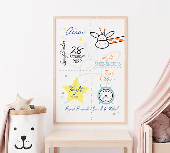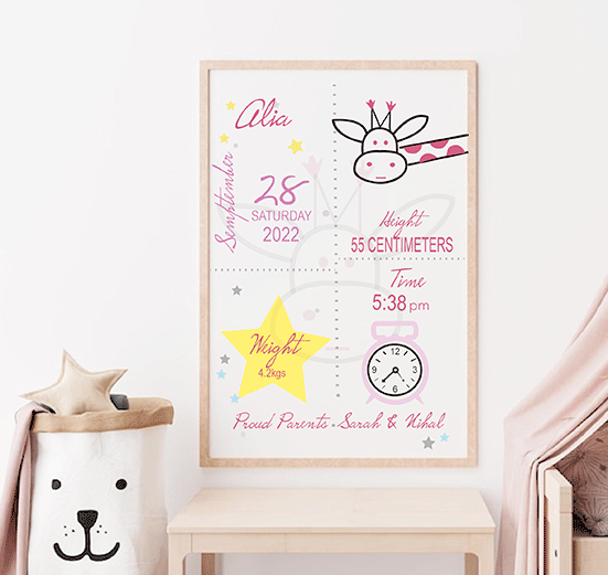 We take immense pride in capturing the essence of life’s most precious moments with this birth statistics frame – giraffe. Our elegantly designed frames are tailor-made to celebrate & cherish the arrival of your little bundle of joy. Commemorate this magical occasion with our exquisite frames that beautifully showcase your baby’s birth details. This can be an extraordinary keepsake to treasure for a lifetime.