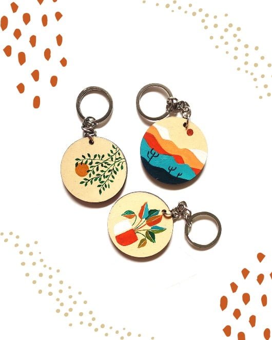 Handpainted unique wooden slice keyring. A mix of abstract, landscape and floral artwork.
