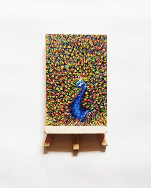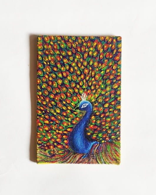 This hand painted peacock painted on a mini canvas using acrylics and coated with varnish to keep the freshness of the artwork intact.